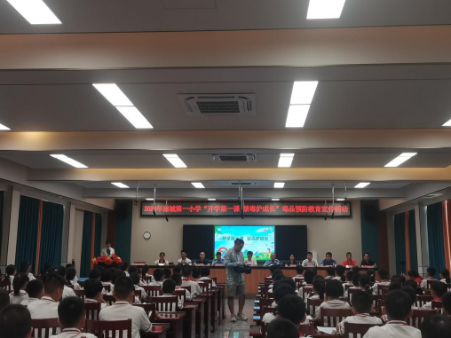 为进一步推进文明校园的建设,提升青少年学生识毒、防毒、拒毒能力,以“不让毒品进校园”为目标,掀起毒品预防宣传教育高潮,最大限度遏制毒品对学生的危害,促进校园和谐稳定,县城综局会同遂城街道办事处、县公安局禁毒办、县人民法院、县烟草局、县教育局、遂城派出所、遂城司法所、县教育局、府前社区等单位到遂溪县遂城第一小学开展“开学第一课”禁毒宣传教育活动。遂城街道党工委副书记邓雄东出席活动。