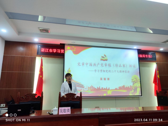 报告会邀请湛江市直机关工委原副书记、市委讲师团讲师吴璇瑛作党的二十大精神专题宣讲报告,报告主题为“党章是党性修养的基本遵循”。宣讲会重点围绕党章的含义、历史沿革、新党章修改的主要内容、加强党性修养四个方面进行了全面系统的讲解,深入浅出,内涵丰富,逻辑严谨,思想深刻。这对干部职工进一步学习党章、遵守党章、贯彻党章、维护党章,学深悟透党的二十大精神具有很强的指导意义。