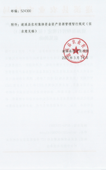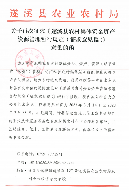 关于再次征求《遂溪县农村集体资金资产资源管理暂行规定(征求意见稿)》意见的函