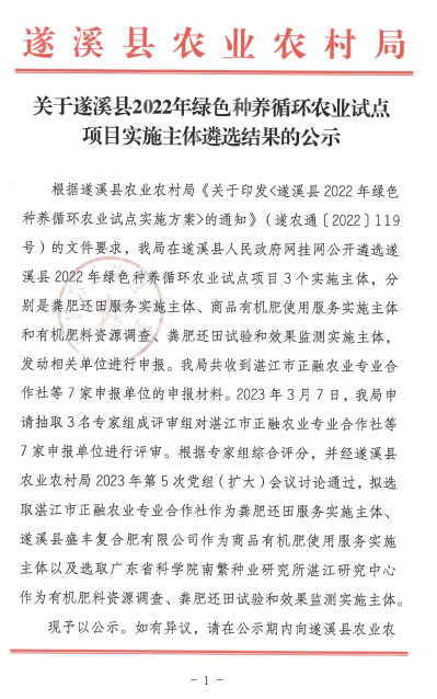 关于遂溪县2022年绿色种养循环农业试点项目实施主体遴选结果的公示