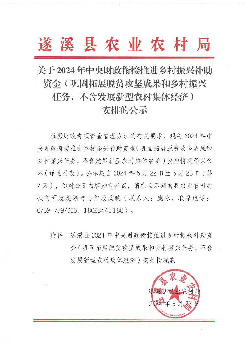 关于2024年中央财政衔接推进乡村振兴补助资金(巩固拓展脱贫攻坚成果和乡村振兴任务,不含发展新型农村集体经济)安排的公示