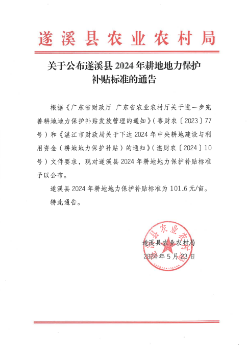 关于公布遂溪县2024年耕地地力保护补贴标准的通告