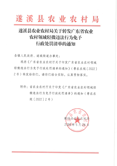 遂溪县农业农村局关于转发广东省农业农村领域轻微违法行为免予行政处罚清单的通知