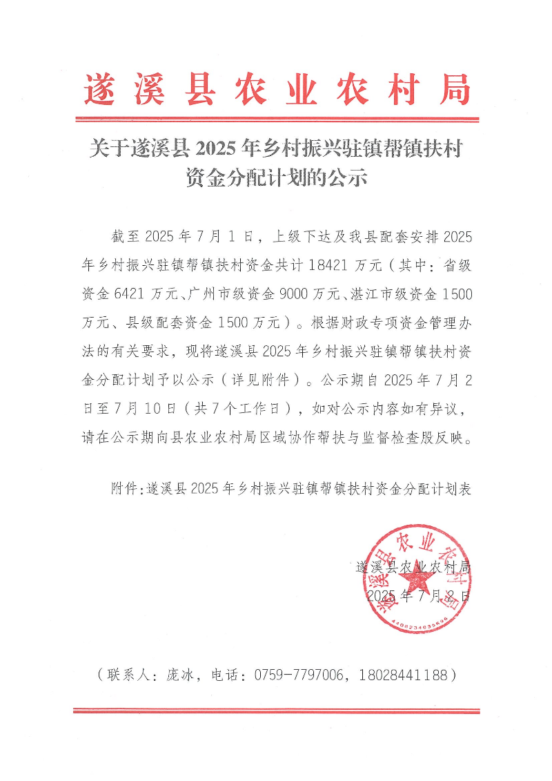 关于遂溪县2025年乡村振兴驻镇帮镇扶村资金分配计划的公示