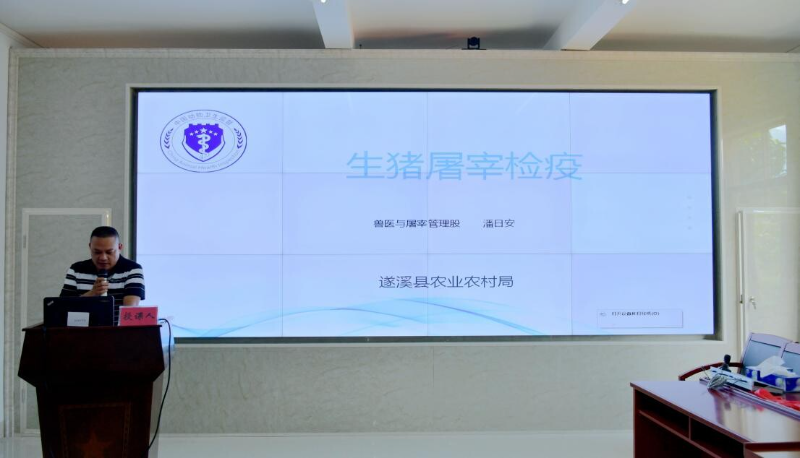 随后,潘日安同志围绕“生猪屠宰检疫”主题进行业务介绍,从“生猪屠宰检疫岗位、生猪屠宰检查现场操作”等两个方面详细介绍了生猪屠宰检疫的基本知识和现场操作中的注意事项,并普及了动物检疫检验涉及的法律法规。通过交流,与会人员对生猪屠宰检疫有了更深层次的了解,认识到屠宰检疫是动物检疫中的重要环节,是畜禽从饲养到餐桌的最后一道关口,也是保障肉品质量安全的最后一道防线。