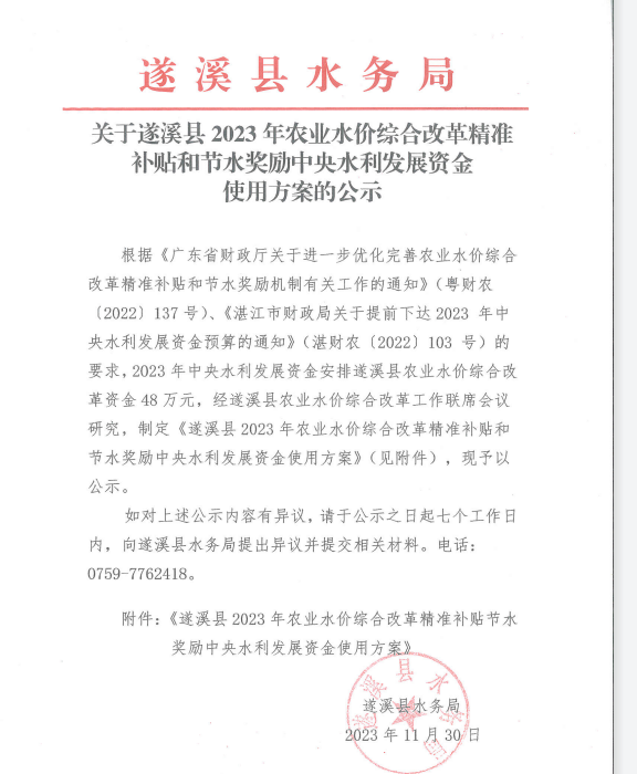 关于遂溪县2023年农业水价综合改革精准补贴和节水奖励中央水利发展资金使用方案的公示.pdf
