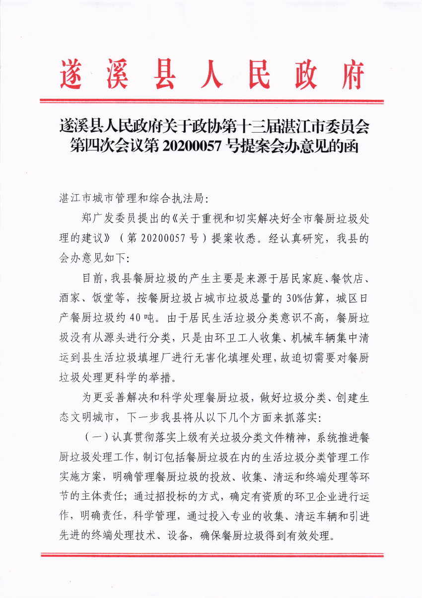 遂溪县人民政府关于政协第十三届湛江市委员会第四次会议第20200057号提案会办意见的函