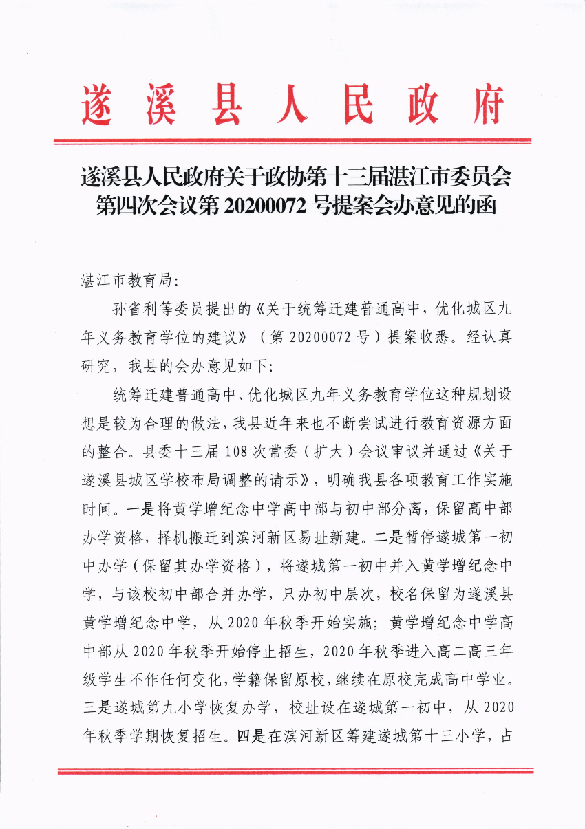 遂溪县人民政府关于政协第十三届湛江市委员会第四次会议第20200072号提案会办意见的函