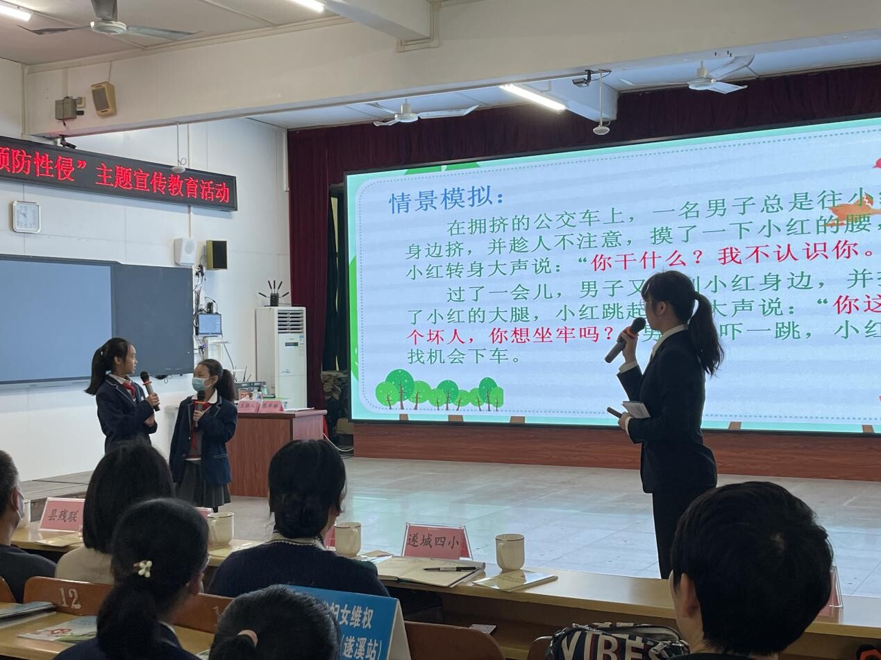 为加大预防性侵知识宣传力度,切实提高未成年人自我保护意识和能力,促进未成年人健康茁壮成长,327日上午,遂溪县妇联联合县检察院、县教育局、县法院、县公安局、县司法局、县关工委、团县委、县民政局、县残联、广东省妇女维权与信息服务站(遂溪站)等单位在遂城第四小学开展“守护童年 牵手共成长”——“关爱女童 预防性侵”主题宣传教育活动,遂溪县妇儿工委副主任、县妇联党组书记、主席王月美出席活动并讲话,县妇儿工委有关成员单位分管领导、遂城四小300多名女学生及教师参加现场活动。活动以线上直播形式开至全县各小学、村(社区)家长学校。