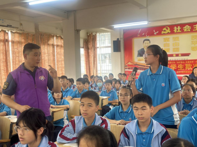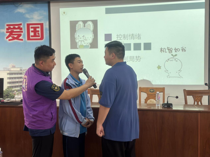 教官围绕知识储备、防护措施、模拟演练三个内容为学生们展开了详细的讲解。教官通过视频、情景模拟的方式让学生们深刻认识学生欺凌是什么、学生欺凌的类型及危害等,从心理戒备、身体戒备、危险识别三方面加强学生的自我保护意识,储备预防学生欺凌的安全知识。“请问同学们,刚才的行为属于校园欺凌吗?”“如果遇到了校园欺凌,大家知道如何自我防范吗?”教官与学生进行场景模拟,带领学生们在体验中学习,在学习中思考,增强学生们的安全意识,让学生们懂得识别危险信息,并掌握求援技巧等防护措施,引导学生们运用法律武器保护自己,自觉抵制各种不良行为和风气,拒绝学生欺凌,远离违法犯罪。