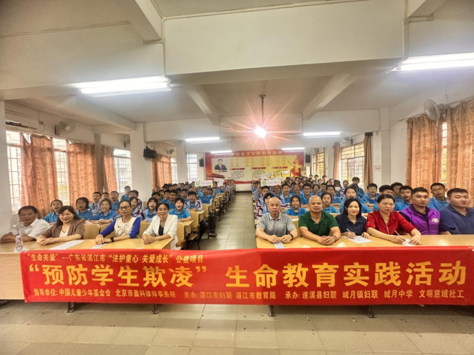 为进一步增强学生抵制和防范校园欺凌的能力,提高学生的法治意识和自我保护意识。2023年5月11日下午,由中国儿童少年基金会、北京市盈科律师事务所指导,湛江市妇联、湛江市教育局主办,遂溪县妇联、遂溪县教育局、遂溪县城月中学共同举办的“生命关爱”——广东省湛江市“法护童心 关爱成长”公益项目“预防学生欺凌”——生命关爱公益项目社会实践活动在遂溪县城月中学顺利开展,共有110名学生参与。