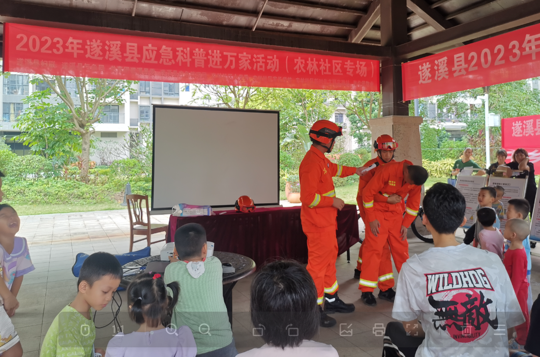 为进一步增强居民防范灾害的意识和自救互救能力,普及防灾减灾知识,保护人民生命和财产安全,20231111日上午,遂溪县妇联、县应急管理局、县气象局、团县委等部门联合在遂城街道农林社区海伦堡小区开展防溺水、防气象灾害、消防安全和急救知识等应急科普知识进万家活动,为家长儿童们上了一堂内容丰富、精彩生动的应急科普课。遂城街道农林社区海伦堡小区约50名家长儿童参加此次活动。