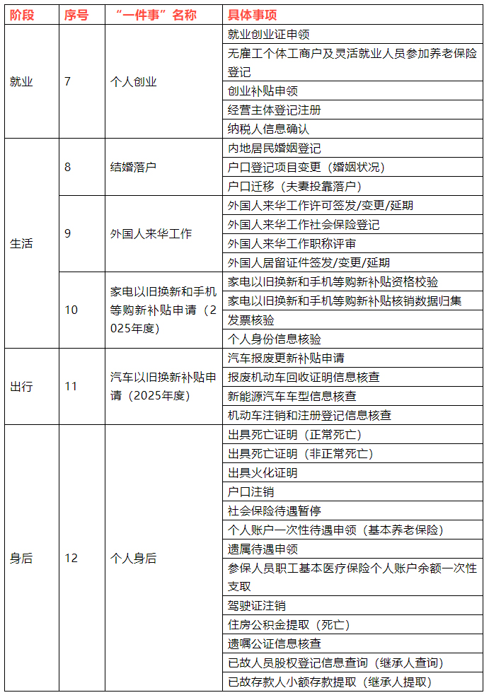 《清单》中包含固定资产投资项目审批、新车上牌等企业事项和结婚落户、家电以旧换新和手机等购新补贴申请(2025年度)、汽车以旧换新补贴申请(2025年度)等个人事项。