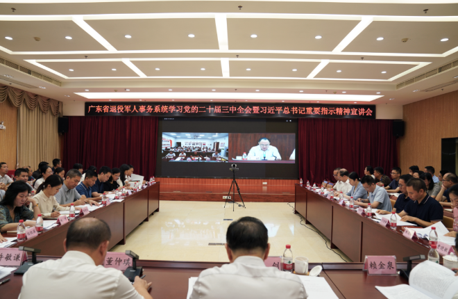 8月14日上午,广东省退役军人事务厅举办党的二十届三中全会暨习近平总书记重要指示精神宣讲会,立足于全覆盖、全贯通、全方位,通过“线下+线上”方式,组织全省退役军人事务系统干部以及部分退役军人代表进行集体学习,致力打通学习贯彻“最后一公里”。广东省退役军人事务厅党组书记、厅长王创出席会议并作宣讲报告,党组成员、副厅长董仲琪主持宣讲会。