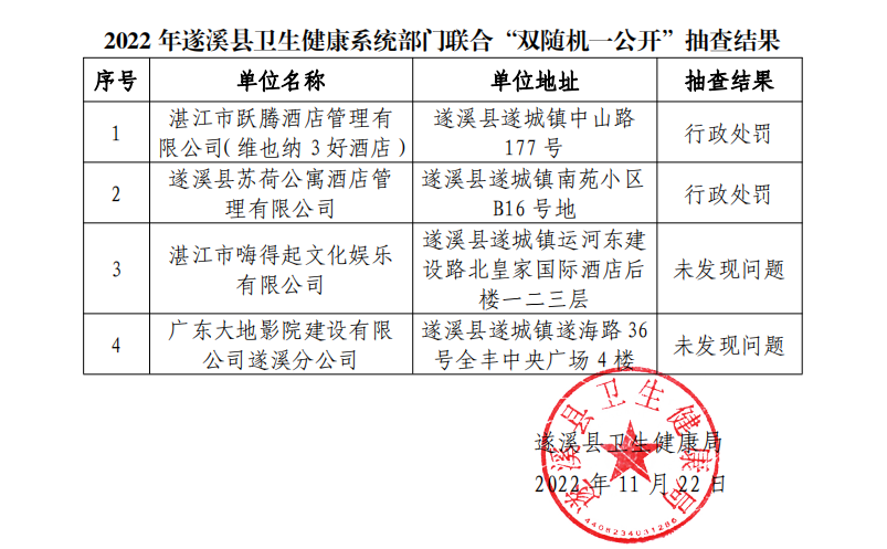 根据《关于印发<湛江市卫生健康系统2022年部门联合“双随机、一公开”抽查工作计划>的通知》(湛卫办函〔2022〕165号)文件要求,遂溪县卫生健康局联合遂溪县市场监督管理局、遂溪县文化广电旅游体育局开展检查工作。2022年遂溪县卫生健康系统部门联合“双随机、一公开”抽查工作已全部完成,现将抽查结果公示如下: