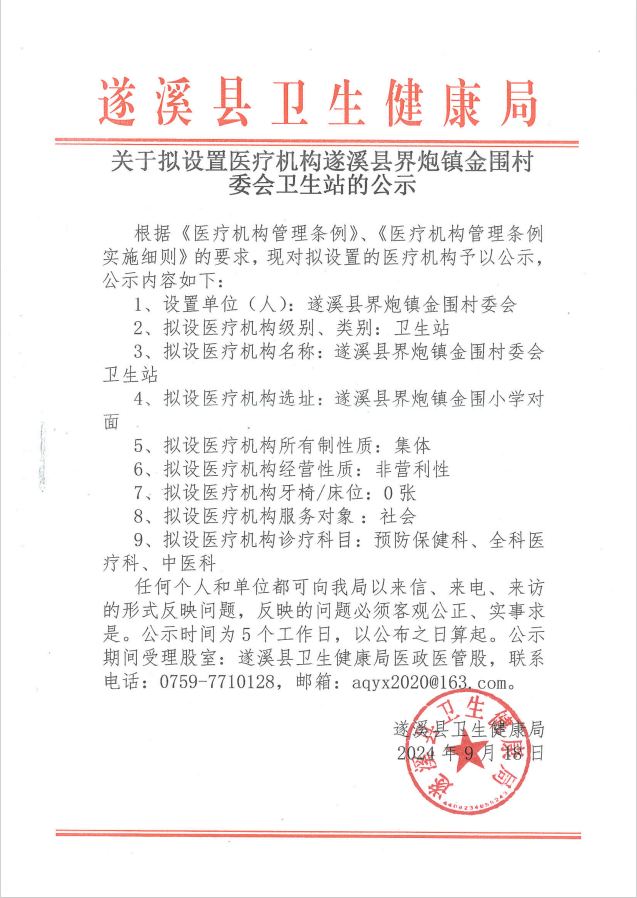 关于拟设置医疗机构遂溪县界炮镇金围村委会卫生站的公示