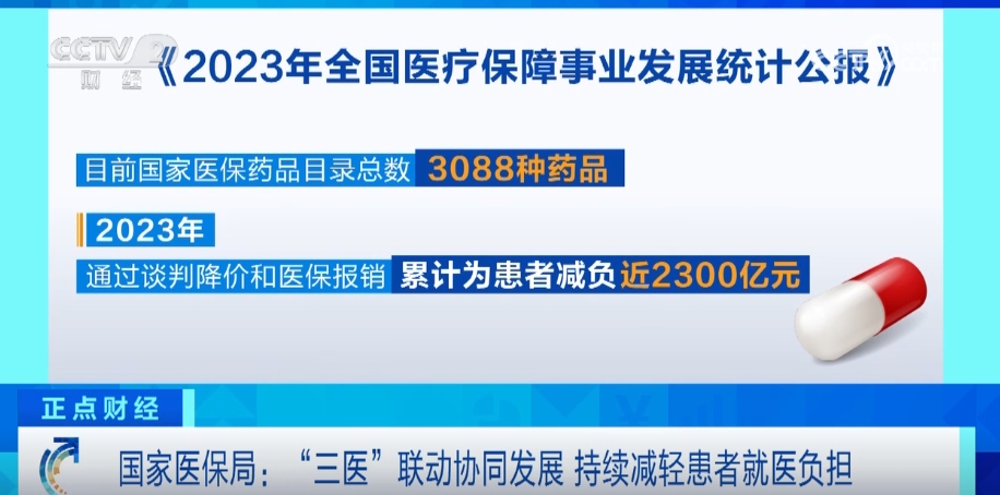 公报显示:目前,国家医保药品目录总数3088种药品,2023年,通过谈判降价和医保报销,累计为患者减负近2300亿元。