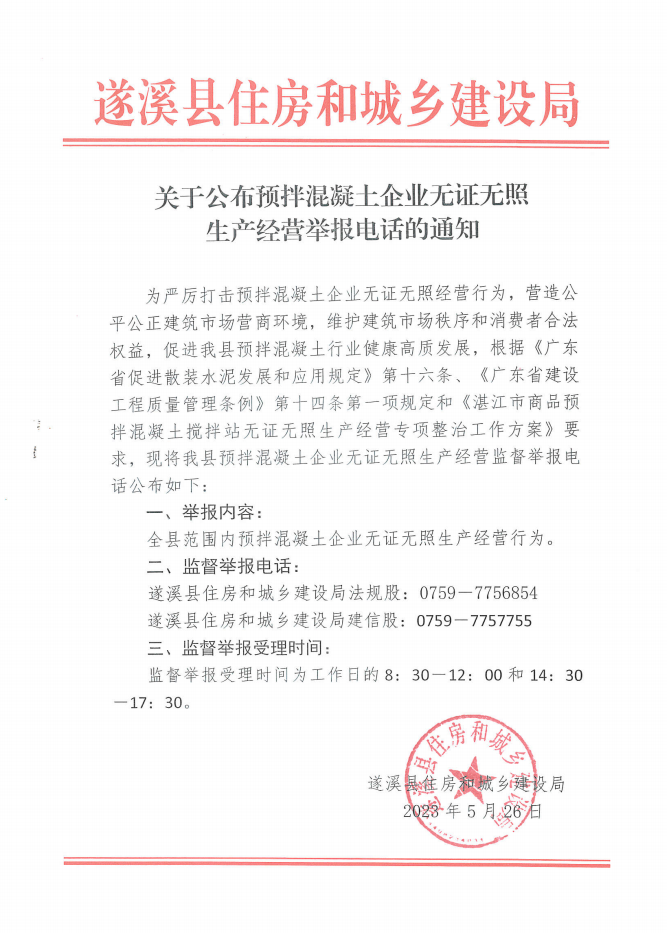 关于公布预拌混凝土企业无证无照生产经营举报电话的通知