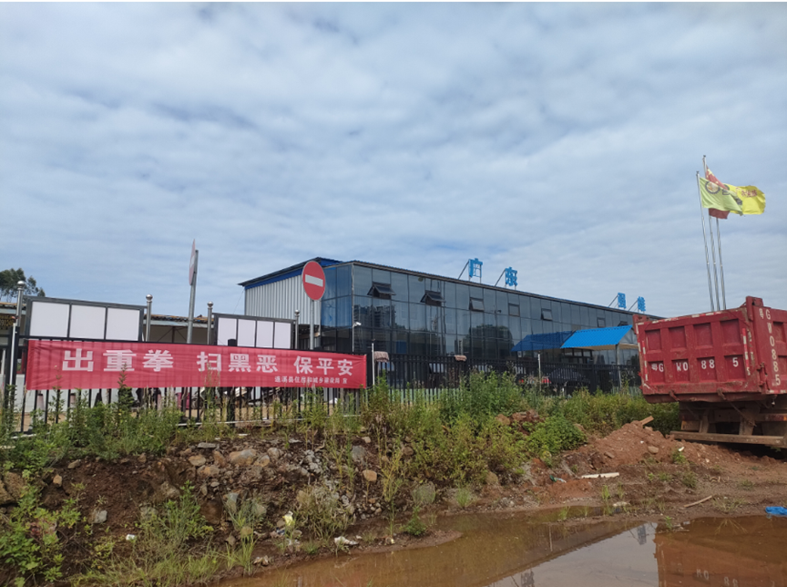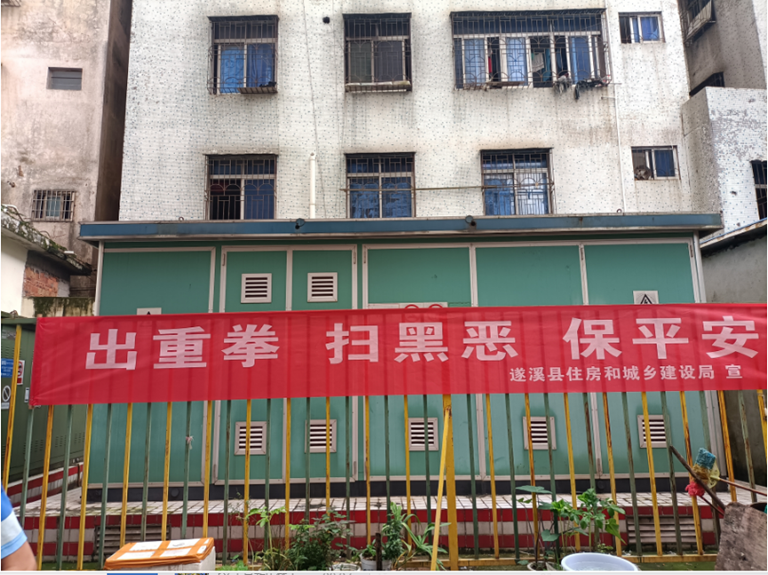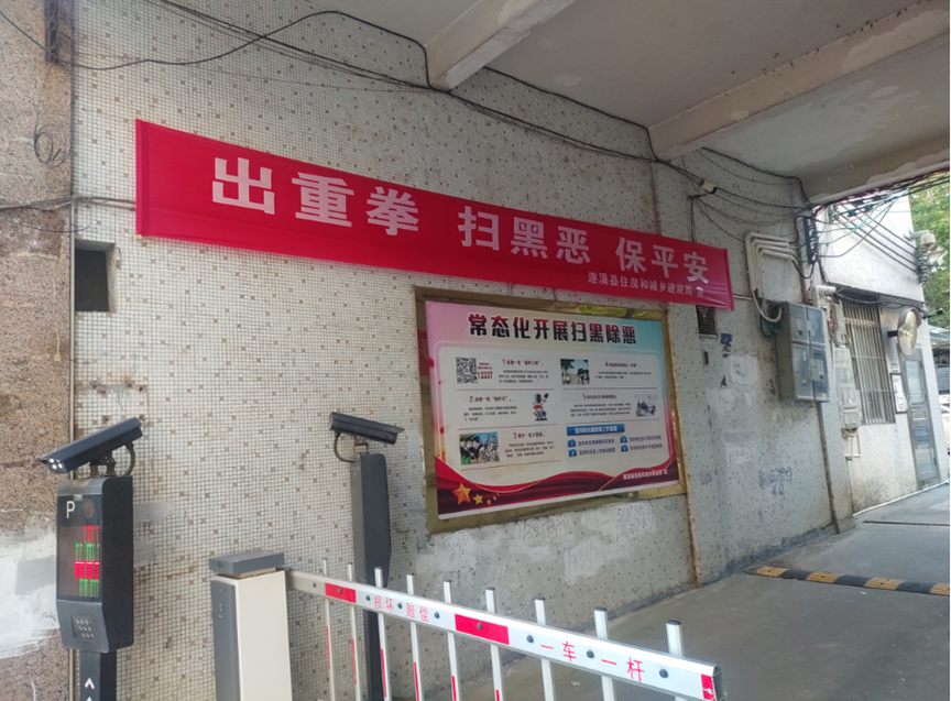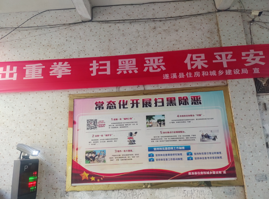 在住建局大院出入口位置悬挂扫黑横幅