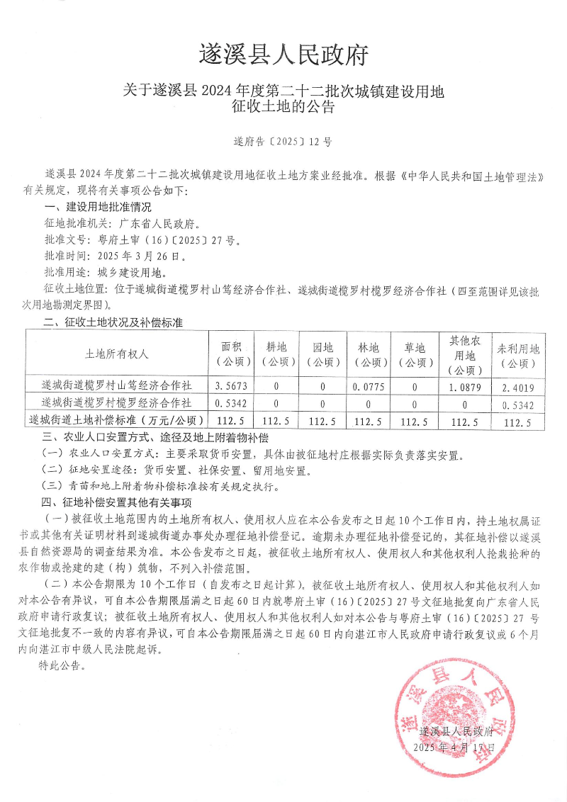 遂溪县人民政府关于遂溪县2024年度第二十二批次城镇建设用地征收土地的公告 遂府告〔2025〕12号