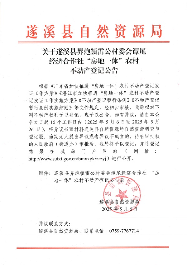 关于遂溪县界炮镇雷公村委会谭尾经济合作社“房地一体”农村不动产登记公告