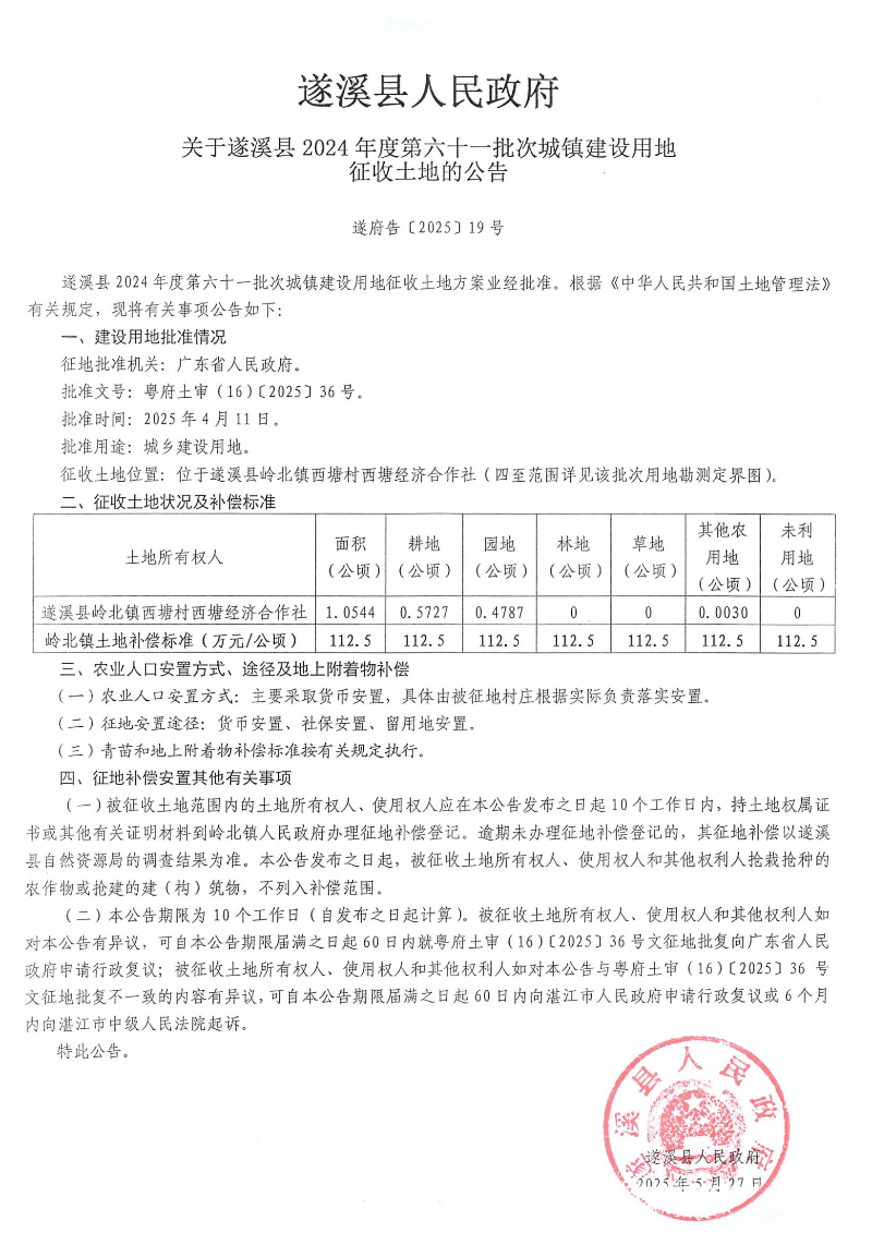 遂溪县人民政府 关于遂溪县2024年度第六十一批次城镇建设用地征收土地的公告 遂府告〔2025〕19号