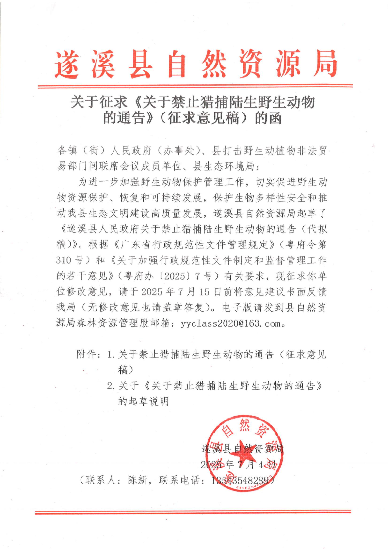 关于征求《关于禁止猎捕陆生野生动物的通告》(征求意见稿)的函