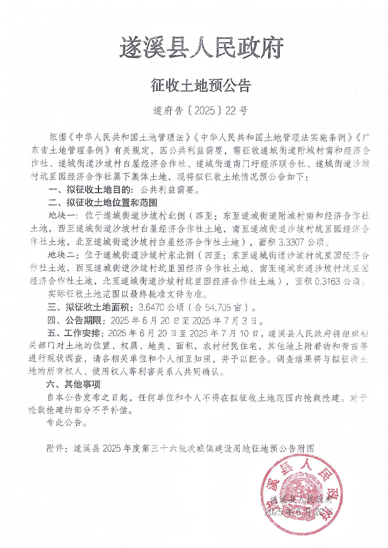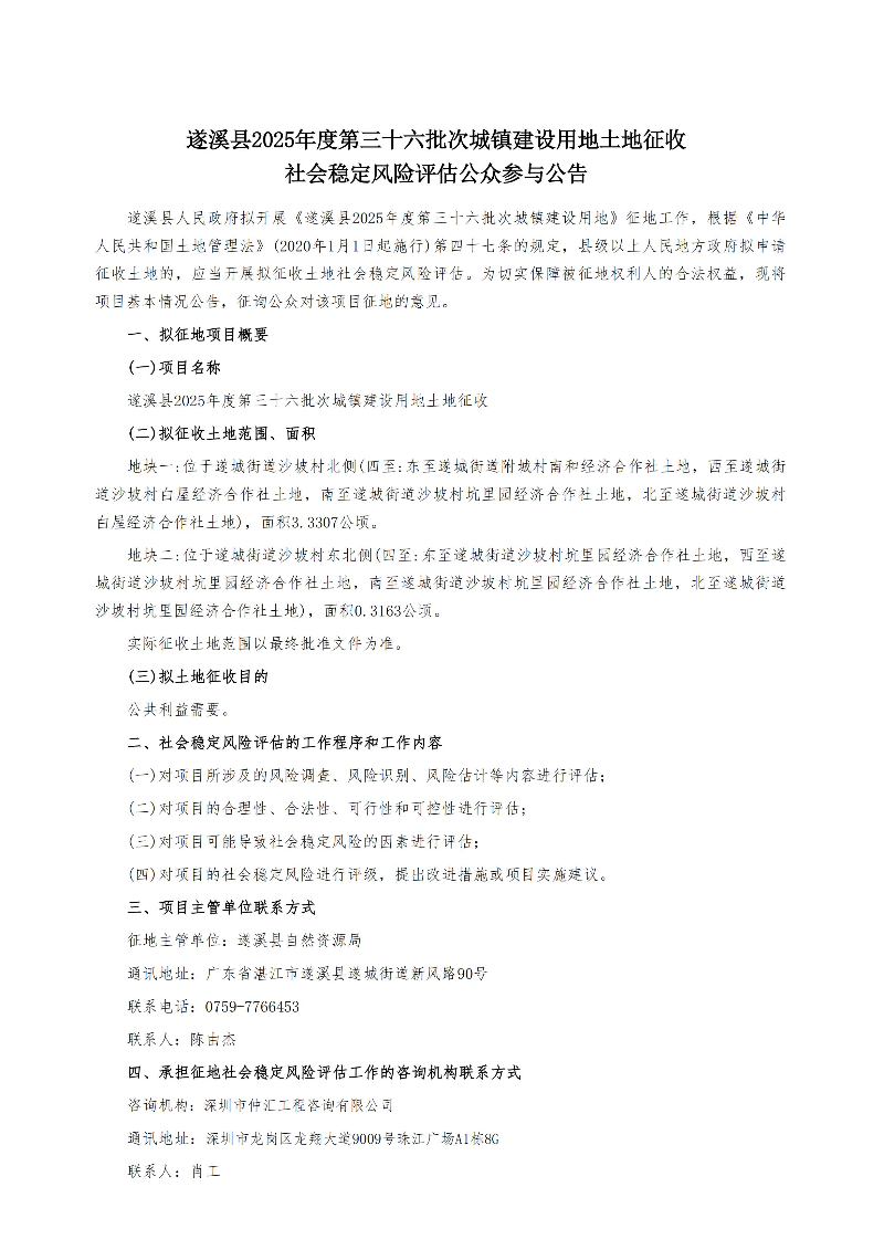 遂溪县2025年度第三十六批次城镇建设用地土地征收社会稳定风险评估公众参与公告