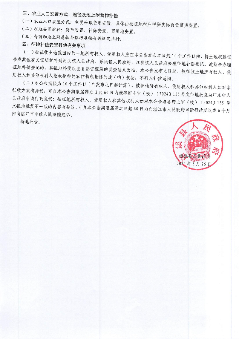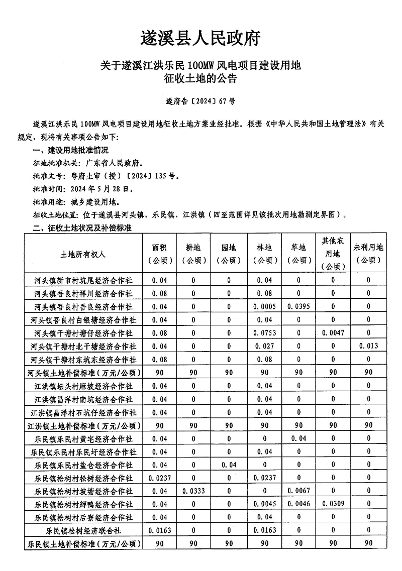 遂溪县人民政府 关于遂溪江洪乐民100MW风电项目建设用地征收土地的公告 遂府告〔2024〕67号