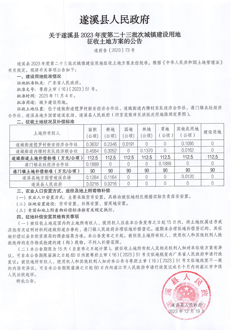 遂溪县人民政府 关于遂溪县2023年度第二十三批次城镇建设用地征收土地方案的公告 遂府告〔2023〕73号