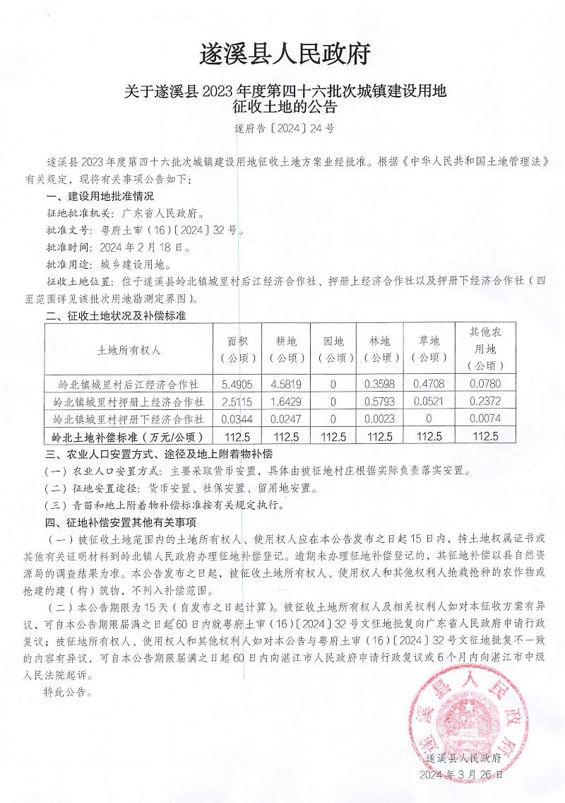 遂溪县人民政府 关于遂溪县2023年度第四十六批次城镇建设用地征收土地的公告 遂府告〔2024〕24号