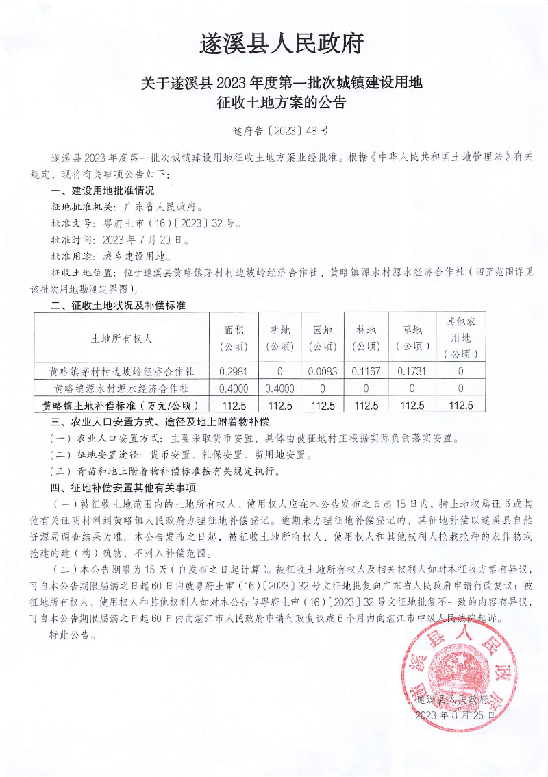 遂溪县人民政府 关于遂溪县2023年度第一批次城镇建设用地征收土地方案的公告 遂府告〔2023〕48号