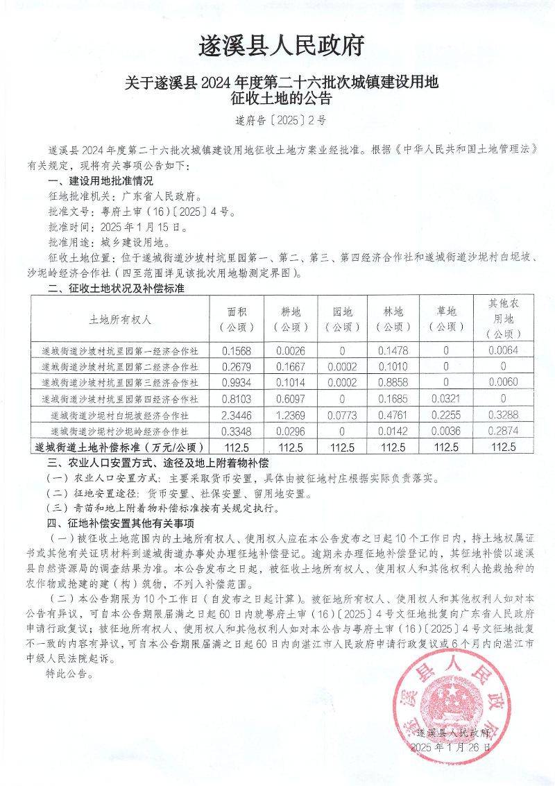 遂溪县人民政府 关于遂溪县2024年度第二十六批次城镇建设用地征收土地的公告 遂府告〔2025〕2号