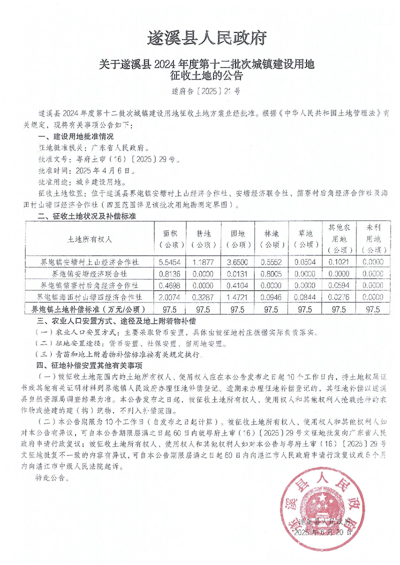 遂溪县人民政府 关于遂溪县2024年度第十二批次城镇建设用地征收土地的公告 遂府告〔2025〕21号