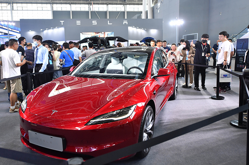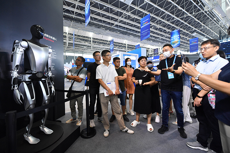 9月6日,在2023中国国际数字经济博览会上,工作人员向参观者介绍特斯拉机器人。