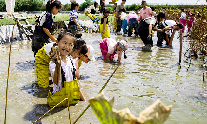 10月3日,小朋友在浙江省宁波市北仑区郭巨街道古镇莲园体验采收莲藕。