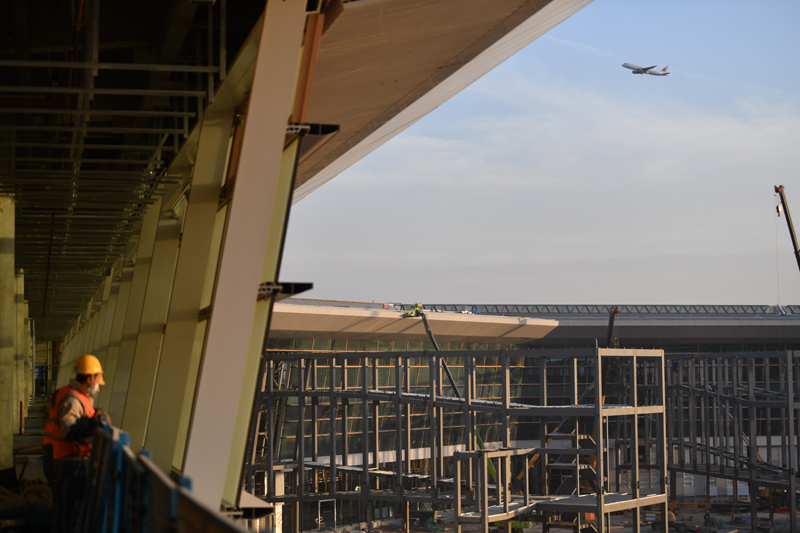 工人在西安咸阳国际机场三期扩建项目施工现场工作(2023年11月29日摄)。新华社记者 张博文 摄