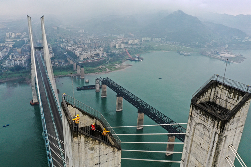 2月8日,桥隧工人在新白沙沱长江特大桥塔顶进行检查作业(无人机照片)。
