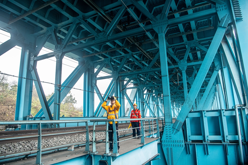 2月8日,重庆工务段重庆桥路车间的桥隧工人在新白沙沱长江特大桥进行检查作业。