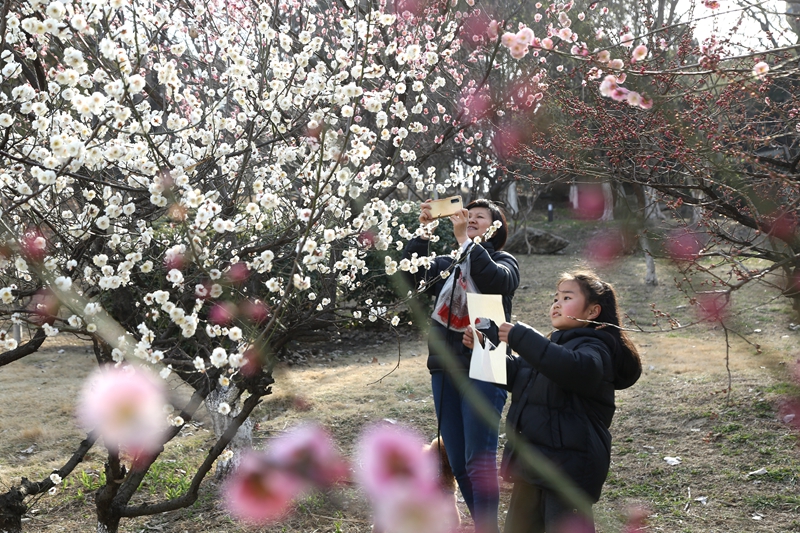 3月17日,游客在江苏扬州何园景区赏花拍照。