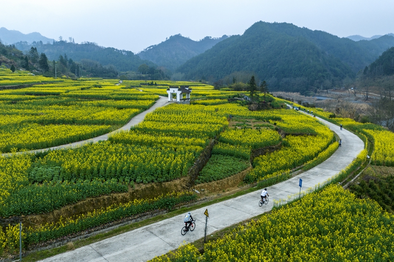 3月17日,在安徽省黄山市歙县昌溪村,自行车爱好者在油菜花海中骑行。