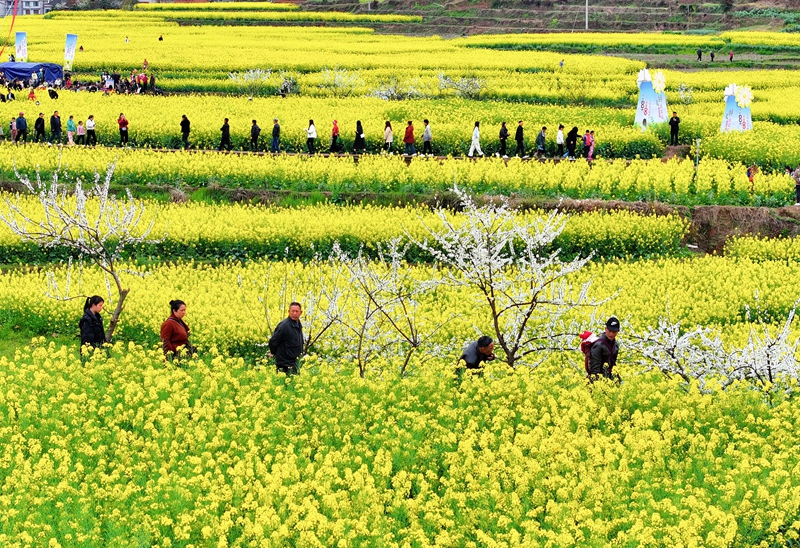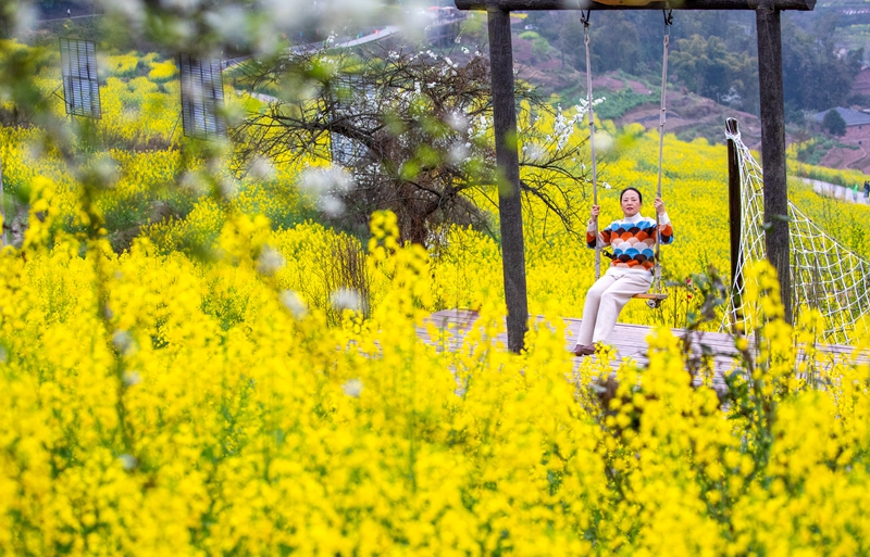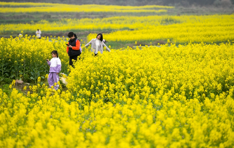3月17日,游客在重庆市南川区峰岩乡千秋村油菜花田里踏青游玩。