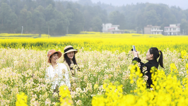 3月17日,游客在湖南省衡阳市衡阳县库宗桥镇华山村油菜花田赏花拍照。