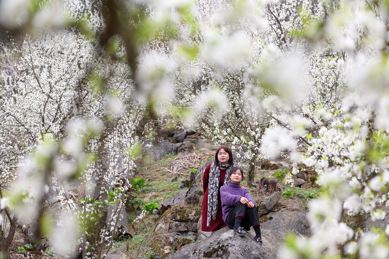 3月17日,人们在贵州省黔东南苗族侗族自治州黄平县旧州镇白纸桥村赏花游玩(无人机照片)。