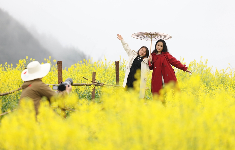 3月17日,游客在贵州省铜仁市玉屏侗族自治县朱家场镇混寨村油菜花田拍照。