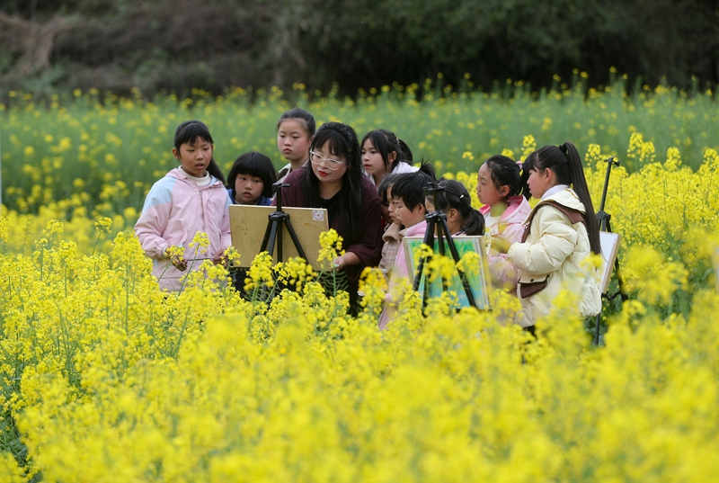 3月17日,人们在贵州省开阳县米坪乡油菜花田里写生。