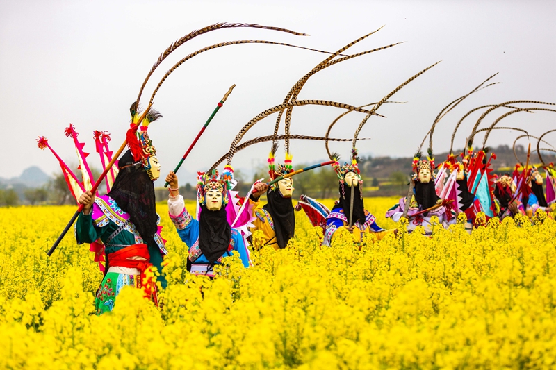 3月17日,地戏艺人在贵州省安顺市西秀区大西桥镇狗场屯村油菜花田为前来赏春的游客表演地戏。