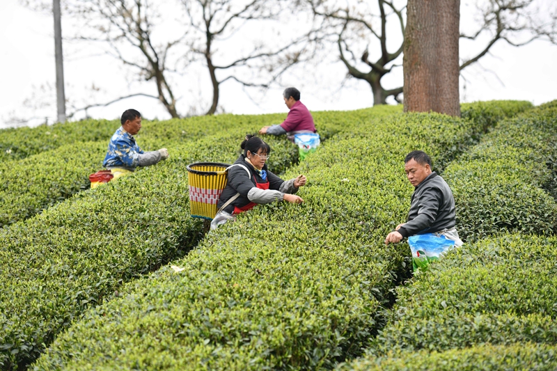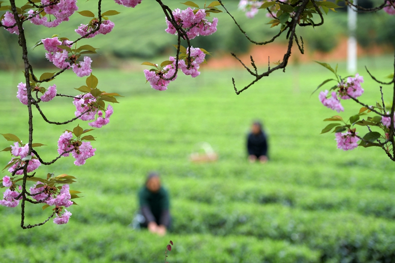 4月6日,村民在凤冈县永安镇田坝社区茶叶基地采摘春茶。