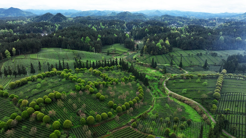 4月6日拍摄的凤冈县永安镇田坝社区茶叶基地一景(无人机照片)。