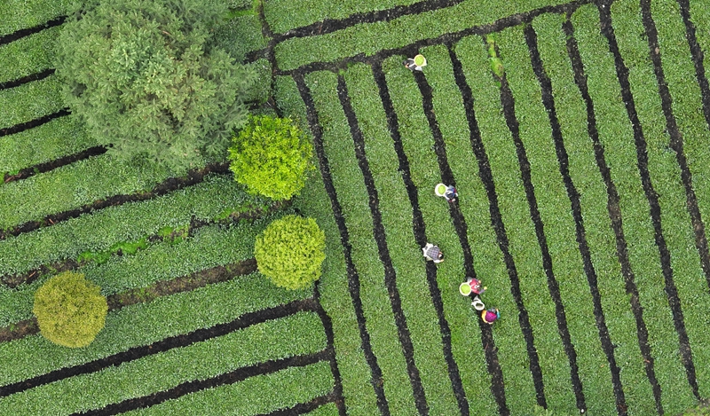 4月6日,村民在凤冈县永安镇田坝社区茶叶基地采摘春茶(无人机照片)。